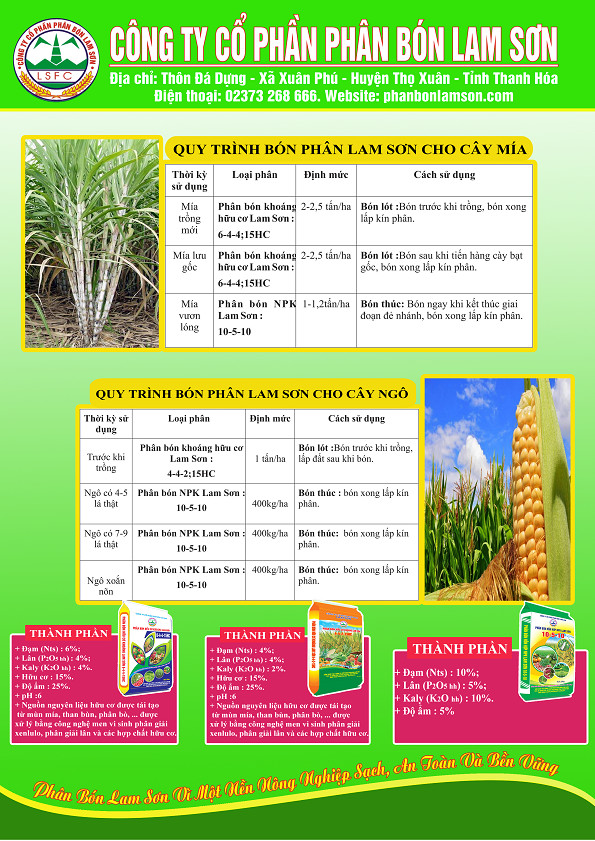 Tờ rơi hướng dẫn sử dụng phân bón Lam Sơn cho cây mía và cây ngô